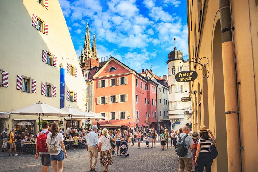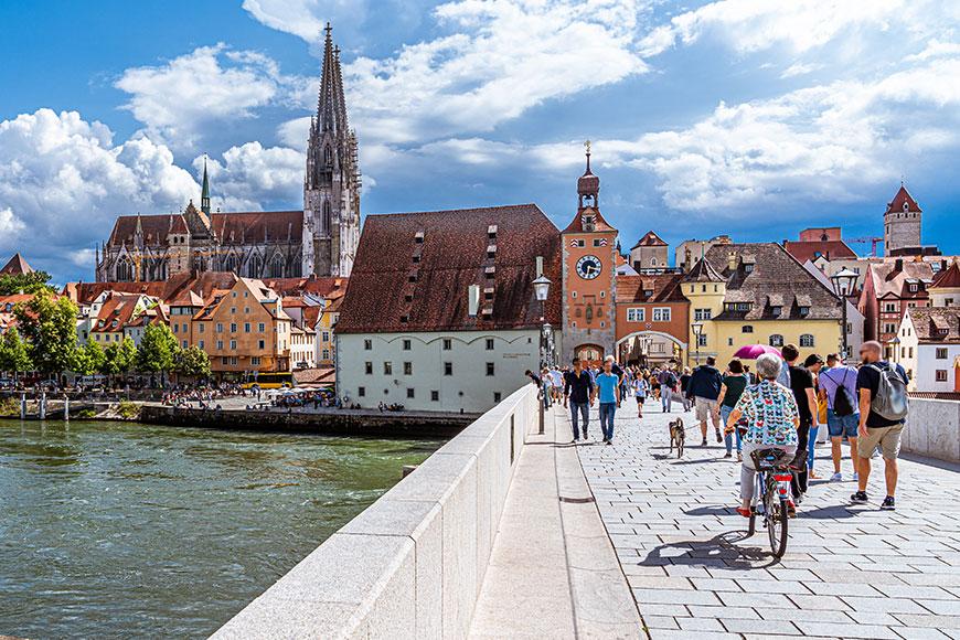 In 1830 is het Walhalla gebouwd in opdracht van de Beierse koning Ludwig I. Deze Griekse tempel ligt op een helling boven de Donau en is via een lange en steile trap (358 treden) te bereiken. De vloeren en muren zijn van marmer. Binnen zijn bustes te bewonderen van beroemde personen uit de geschiedenis (entree € 4,50). We rijden verder naar Regensburg. Het oude centrum van de stad staat op de Werelderfgoedlijst. In de knusse straatjes zijn moderne winkels gevestigd in historische gebouwen en gezellige cafeetjes in middeleeuwse gewelvenruimtes. Tip, proef een typisch streetfood-hapje: een Regensburger worst in een knapperig broodje (“Semmel”), meestal geserveerd met pittige mosterd en augurk. Simpel, stevig, en zó lekker.